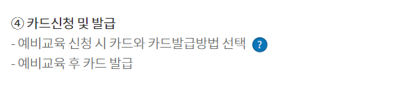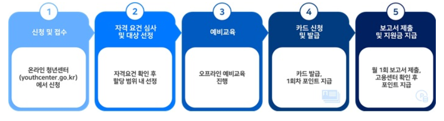 위 사진에서 볼 수 있듯이, 인터넷으로 간단하게 신청할 수 있으며, 예비교육을 수료후 카드신청 과 발급이 이뤄지는 것을 볼 수 있습니다. 신청하는 것은 온라인 청년센터에서 가능하며, 전혀 어렵지 않게 신청할 수 있기 때문에, 위를 참고해서 신청하실 때 보고 하시면 되겠습니다.