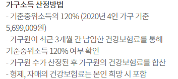 중위소득의 120%는 얼마나 되는 것일까요? 2020년 4인 가구 기준 5,6999,009원이라고 나와있습니다. 이는 건강보험료를 통해 확인한다고 합니다.