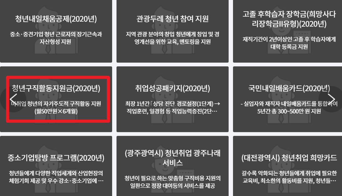 온라인 청년센터에 들어가보시면 다음과 같이 여러가지 청년 지원 서비스가 있습니다. 정말 다양한 지원이 있기 때문에, 잘 살펴보시고 자신에게 맞는 서비스를 이용하시면 좋을 것 같습니다. 저희가 알아볼 청년구직활동지원금도 왼쪽 중간에 위치하고 있습니다. 클릭해줍니다.
