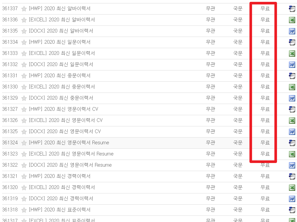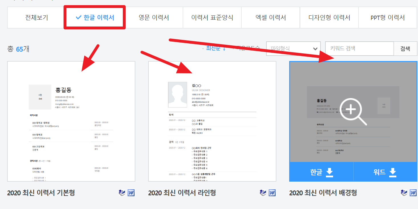 전체보기 옆에 한글이력서를 클릭하셔서 원하시는 이력서 형을 골라서 이력서 무료 다운을 진행해주시면 됩니다. 라인형, 기본형, 배경형 모두 무료다운이 가능합니다.