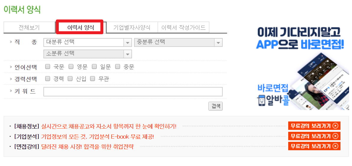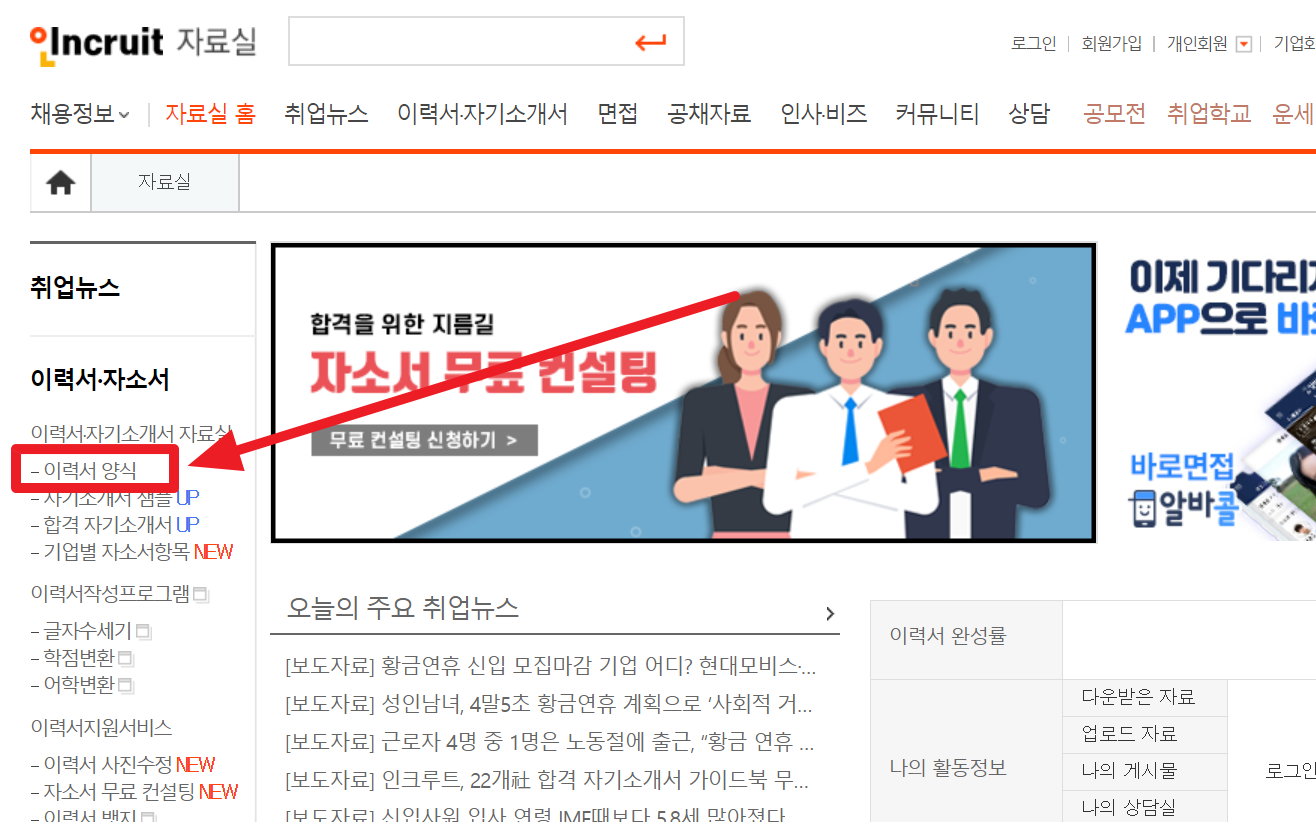 화면에 나오는것처럼 잡코리아에 들어오면 [뉴스,자료] -> [이력서 양식]을 클릭해주시면 됩니다.