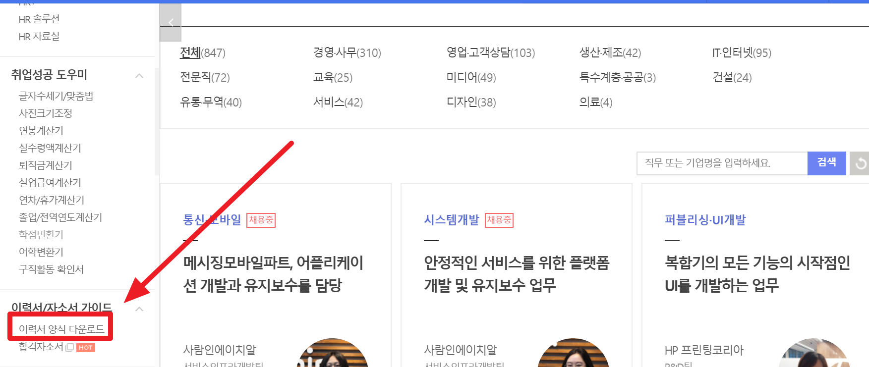 왼쪽 메뉴 바를 쭉 밑으로 내리면 합격자소서 위에 이력서 양식 다운로드가 보일 겁니다. 이걸 클릭해주시면 됩니다.