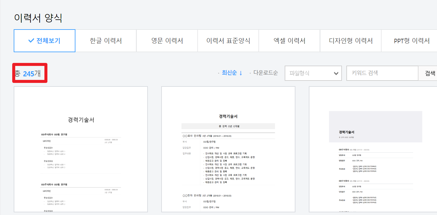 그러면 다음과 같이 총 245개의 이력서를 보실 수 있습니다. 여기서 원하시는 이력서 형태를 고르셔서 사용해주시면 됩니다. 무료인 대신에 로그인이 필요하니 로그인해서 이용해주시면 되겠습니다. 그러면 예를 들어서 한글 이력서가 필요하다고 하면 다음과 같이 설정하셔서 보시면 됩니다.