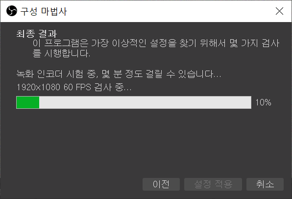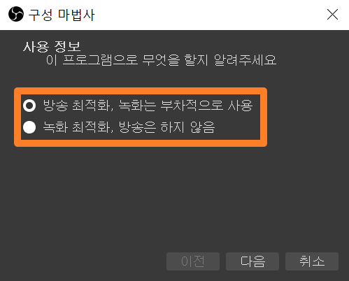 obsstudio를 처음 사용하게 되면 어떻게 사용할까 막막하실텐데요. 설정부분에서 전혀 어렵지 않게 설정할 수 있습니다. 처음 obs studio를 실행하게 되면 다음과 같이 구성마법사라는 창이 뜨게 됩니다. 이 창을 고대로 이용하셔서 쭉쭉 진행하시면 전혀 어렵지 않게 초기 설정을 마칠 수 있습니다.