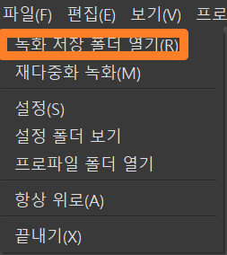녹화가 된 파일은 왼쪽 상단 파일 - 녹화 저장 폴더 열기를 통해서 잘 녹화가 됐는지 확인할 수 있습니다.