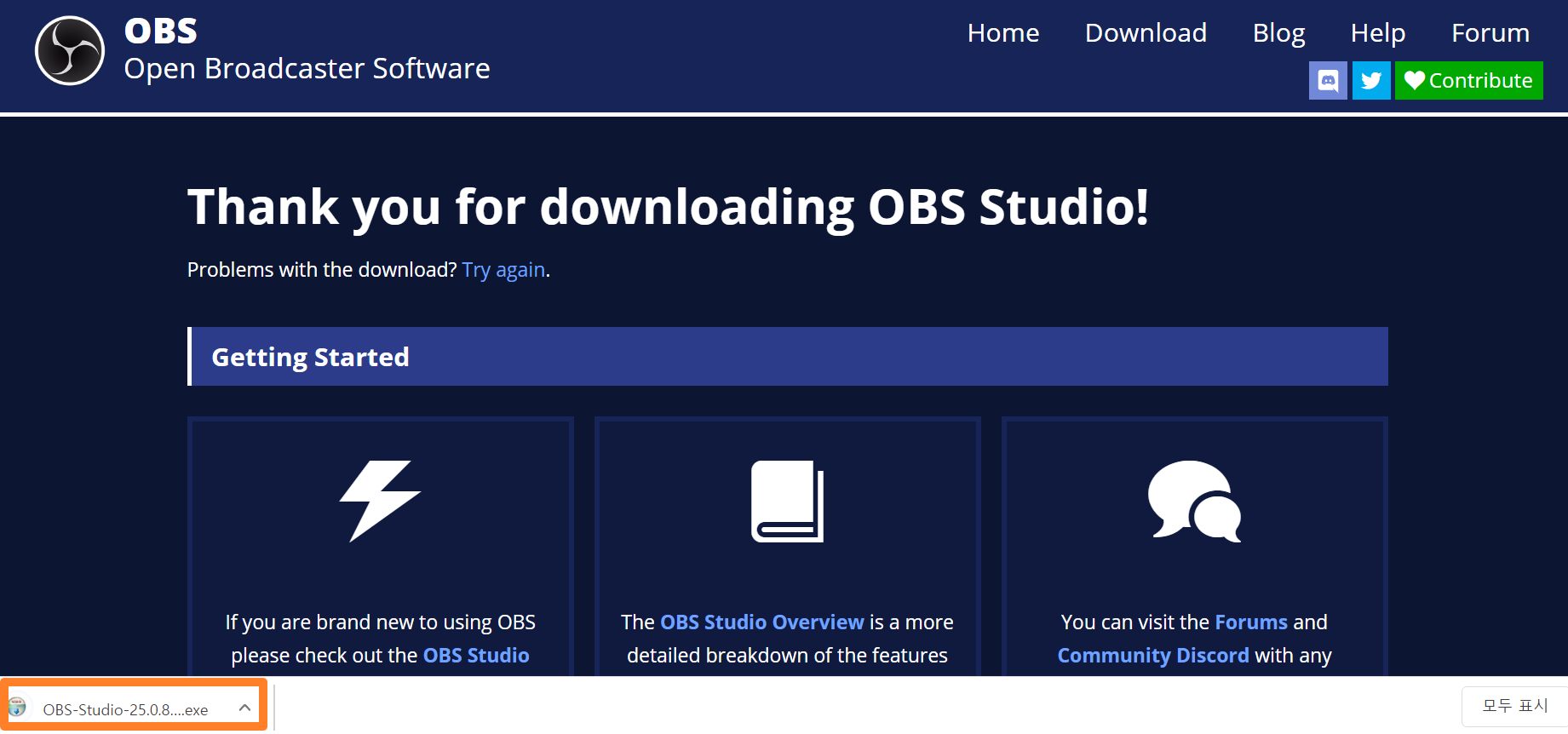 설치가 완료되면, 다시 obsstudio 설치 프로그램을 열어 마저 못한 다운로드를 완료해주시면 됩니다.