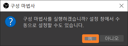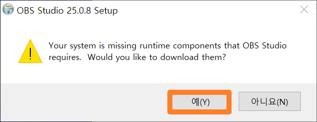 보통 Next를 눌러주게 되면 바로 화면이 전환되지만, 저처럼 오류가 뜰때도 있습니다. 이럴경우에는 지금 OBS 스튜디오를 이용하는데 필요한 프로그램이 깔려있지 않다는 뜻입니다. 그래서 다운로드를 추가적으로 받아줘야 합니다. 방법은 어렵지 않습니다. [예]를 눌러서 다운로드를 진행해주시면 됩니다.