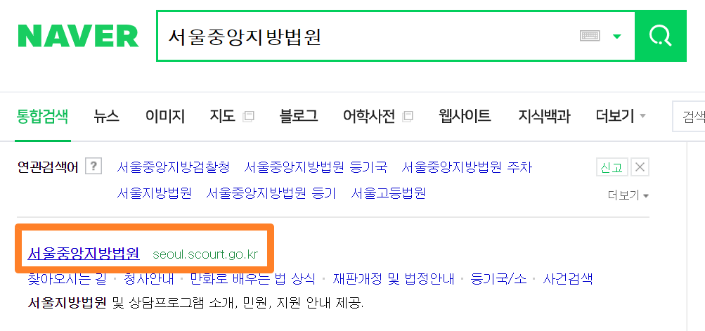 먼저, 네이버에서 [서울중앙지방법원]을 검색해서 들어가줍니다. 제일 위에 있는 공식 홈페이지로 들어가주시면 됩니다.