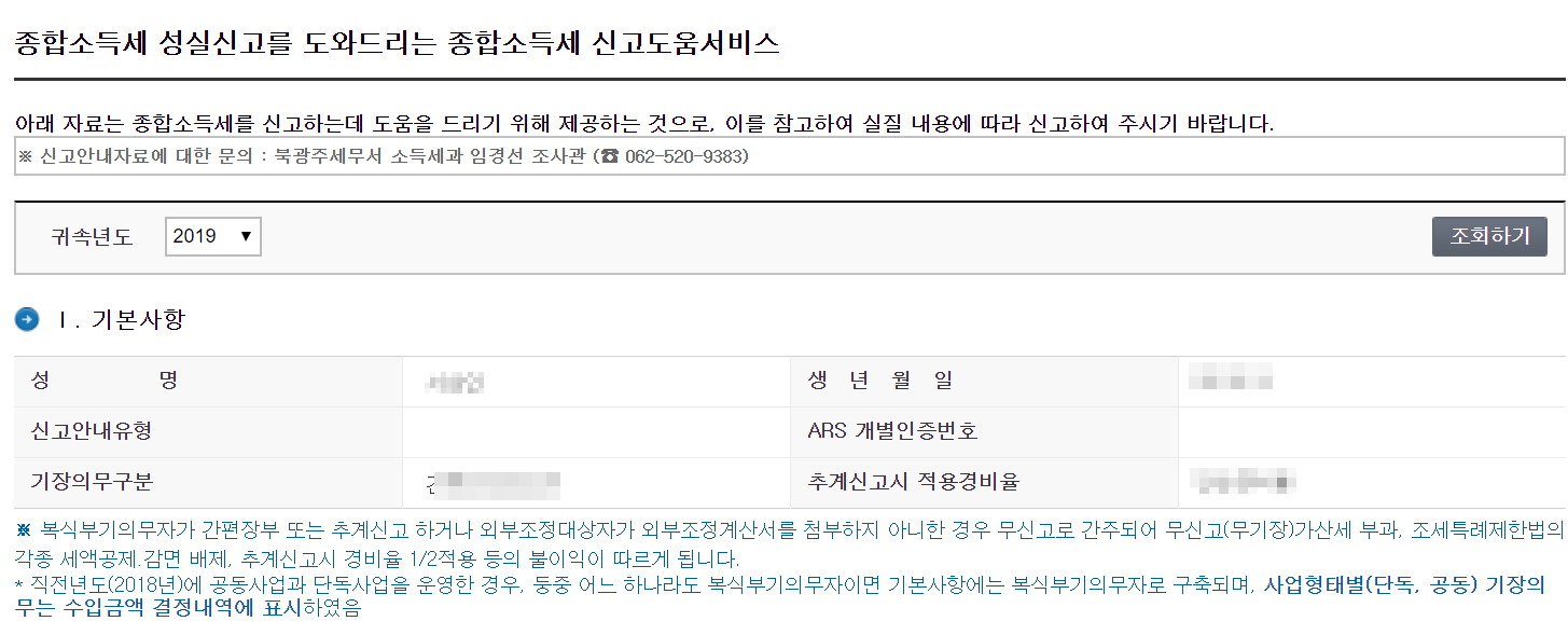 그러면, 종합소득세를 신고하는데 도움을 주기위한 내용이 나옵니다. 신고안내유형,기장의무구분,추계신고시 적용경비율과 같은 것이 나옵니다. 그러면 이에 맞게 세금 신고를 진행해주시면 되겠습니다.