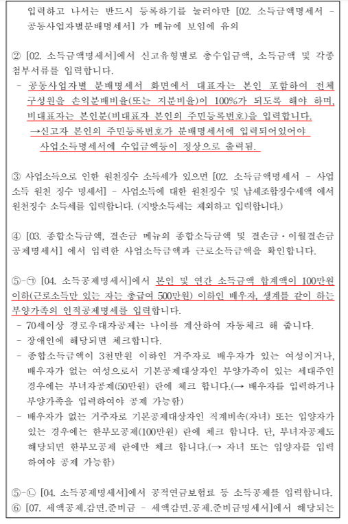 사진에서 필요한 부분은 읽어보시고 신고 하실 때 참고하시면 좋을 것 같습니다. 또한, 사진이 잘 안보인다면 국세청 - 종합소득세 신고 - [작성방법요약]을 누르시면 다음 파일을 다운로드 받으실 수 있으니 참고하시기 바랍니다. 아래에는 종합소득세 신고와 관련해서 많은 사람들이 궁금해하는 질문들에 대한 답변을 모아봤습니다. 이 점을 참고해서 막히는 부분이 있다면, 해결해보시기 바랍니다.
