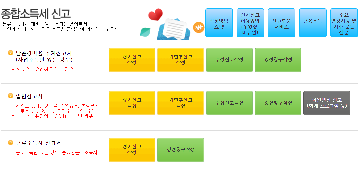 신고유형만 맞게 해서 세금신고서를 작성하면 어려운 것이 없습니다. 그렇기 때문에 이 것을 참고해서 진행해주시면 되겠습니다.