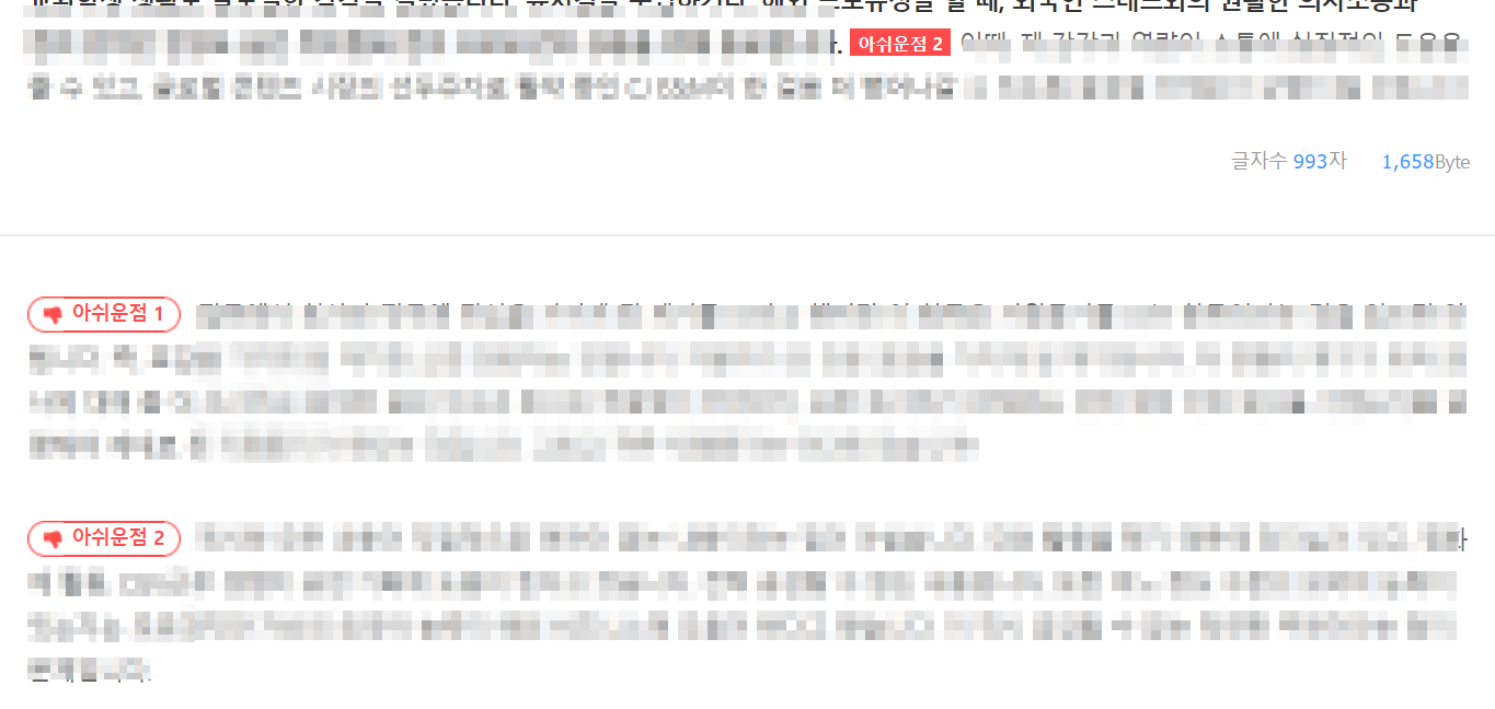 이런식으로 글 문단에서 어떤점이 아쉬웠는지, 아쉬운점코멘트를 통해서 확인이 가능합니다. 이 자기소개서 샘플 읽어보시고, 이런식으로 쓰는구나, 이런 점은 보완해야겠구나 하면서 감을 잡으실 수 있습니다.