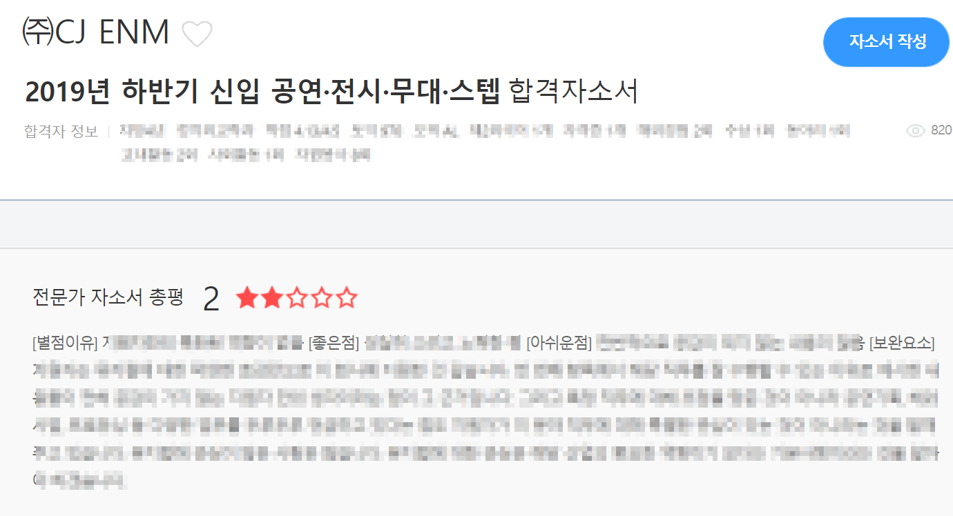 자기소개서 샘플 부분에는 잡코리아에서 활동중이 전문가가 자소서를 읽고 내린 총평, 별점이유와 좋은점 아쉬운점, 보완요소들이 나와있습니다. 또한 합격자 정보를 통해, 토익이 몇점인지, 학교가 4년제인지 등도 확인이 가능합니다.