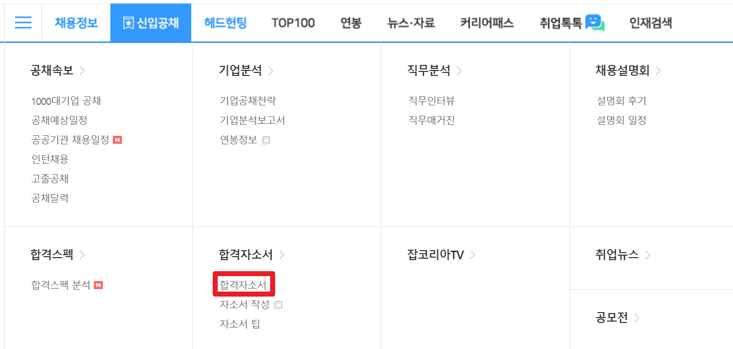 [합격자소서] - 합격자소서를 보시면 자기소개서 샘플 확인이 가능합니다. 따라서 합격자소서를 클릭해줍니다.