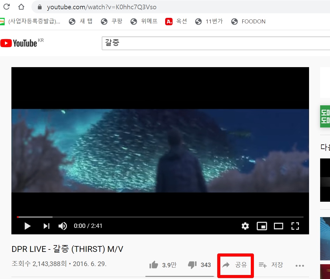 이렇게 원하는 유튜브 사이트로 들어와서 저기 보이는 공유버튼을 눌러줍니다.