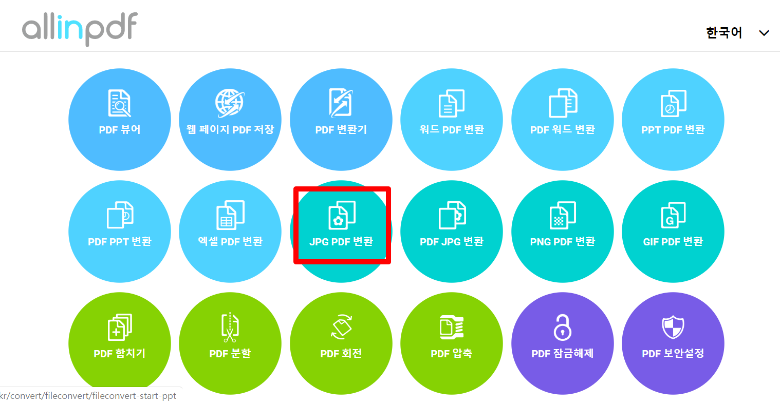 들어오게 되면 정말 다양한 기능을 보실 수 있습니다. PDF뷰어, PDF변환기, PDF 분할, 압축 정말 다양하게 있습니다. 이중에서 저희가 할 jpg pdf 변환 중간에 있는 것을 확인할 수 있습니다. 바로 클릭해줍니다.