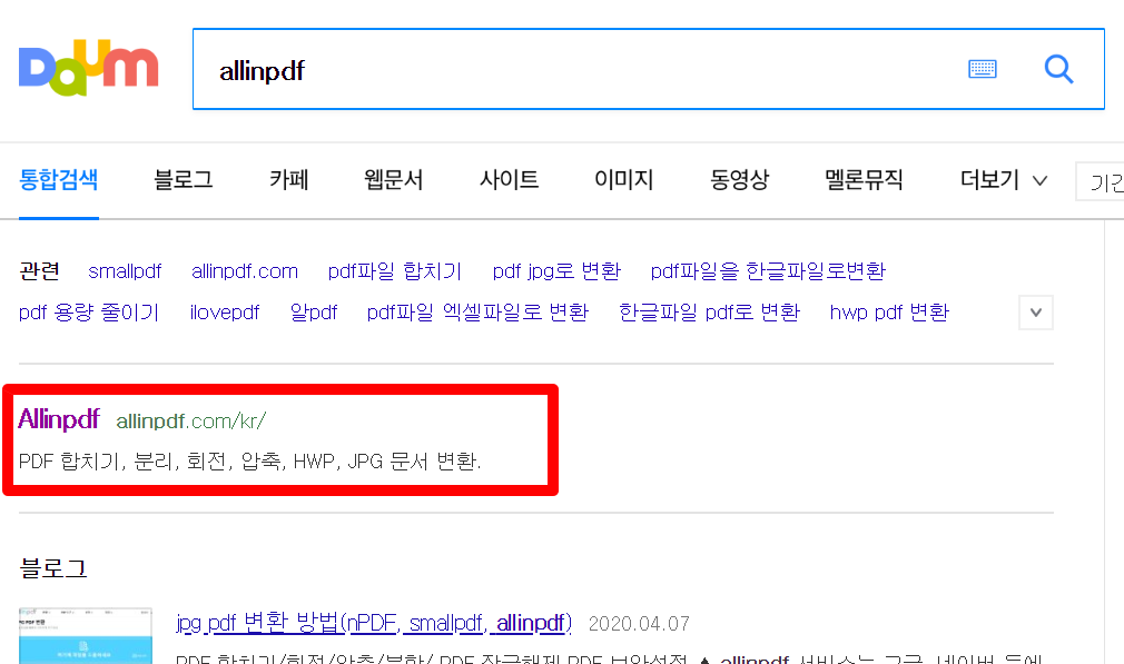 먼저 첫 번째 싸이트는 Allinpdf입니다. Allinpdf는 PDF 합치기, 분리, 회전, 압축, HWP, JPG 문서 변환까지 다양한 기능을 제공하는 pdf 문서 변환 솔루션 싸이트입니다. 그래서 많은 분들이 이용하고 있는 사이트입니다. 인터넷에 간단하게 검색해서 클릭해줍니다.