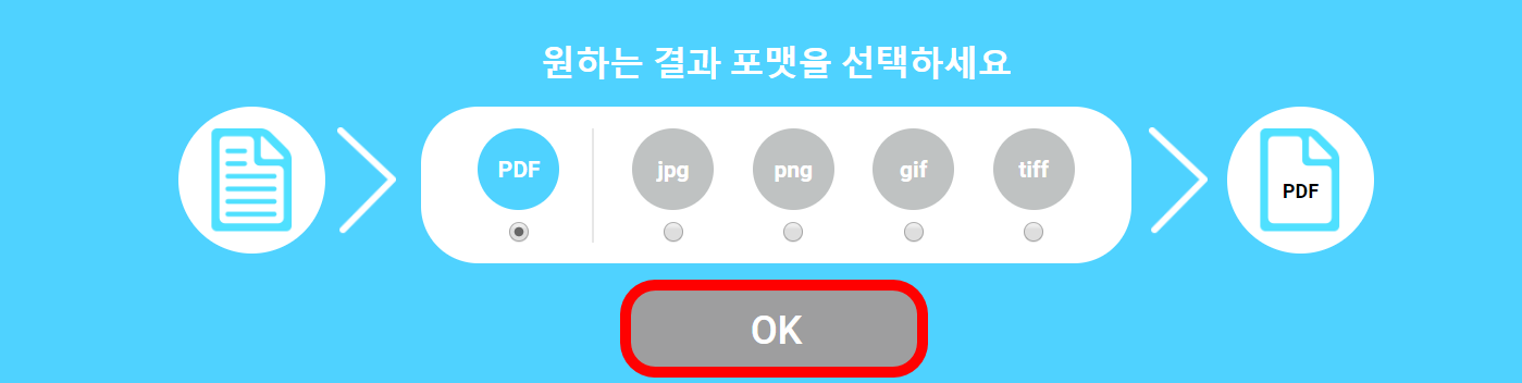 파일을 업로드 하게되면 다음과 같은 화면이 뜨게 됩니다. 원하는 결과 포맷을 선택하라는 창인데 기존에 선택된 대로 pdf를 골라서 진행해주시면 되겠습니다.