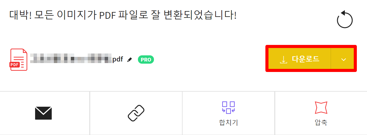 jpg pdf 변환이 완료되면 다음과 같이 대박! 모든 이미지가 잘 변환됐다는 문구과 함게 오른쪽 다운로드를 받을 수 있는 버튼이 생성됩니다. 이 버튼을 누르셔서 다운로드를 마무리 해주시면 되겠습니다.